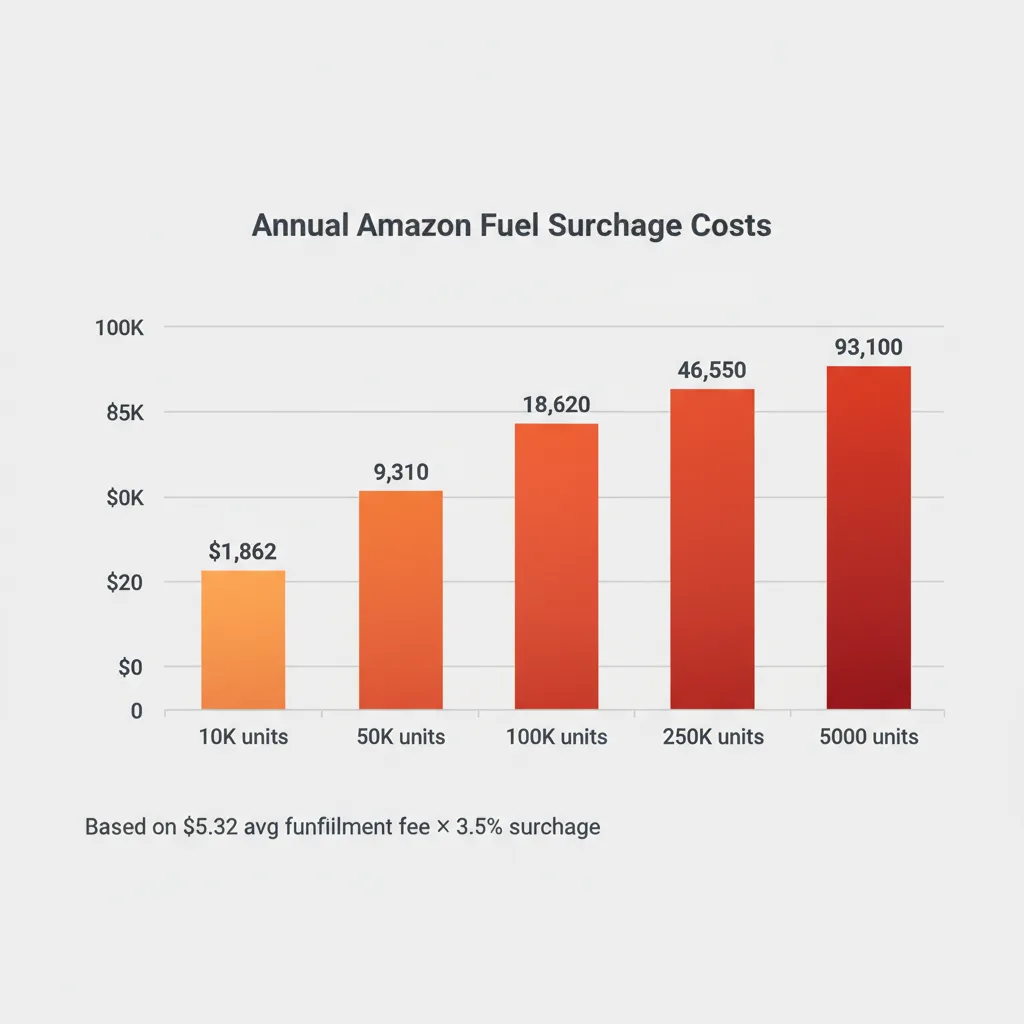 A: The surcharge is calculated as a percentage of your base FBA fulfillment fee per unit. At 3.5% on a $5.32 standard fulfillment fee, the per-unit cost is approximately $0.19. For high-volume brands, this compounds quickly: 100,000 units per year at that rate generates roughly $18,600 in annual surcharge spend.